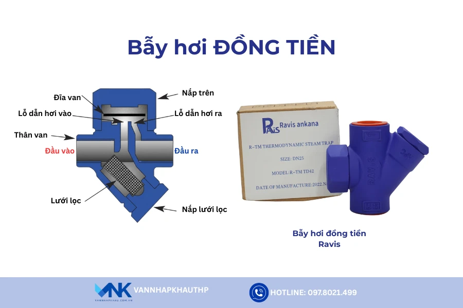 | Đồng tiền (Disc Trap) | Chênh lệch áp suất theo Bernoulli | Đơn giản, giá thành thấp, dễ bảo trì | Không dùng cho áp suất quá thấp hoặc áp suất ngược cao | Hệ thống sấy khô, lò hơi áp suất trung bình |