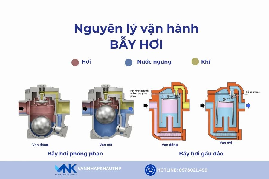 Bẫy hơi hoạt động dựa trên sự chênh lệch tính chất vật lý giữa hơi bão hòa và nước ngưng để tự động tách và xả nước ngưng ra khỏi hệ thống.