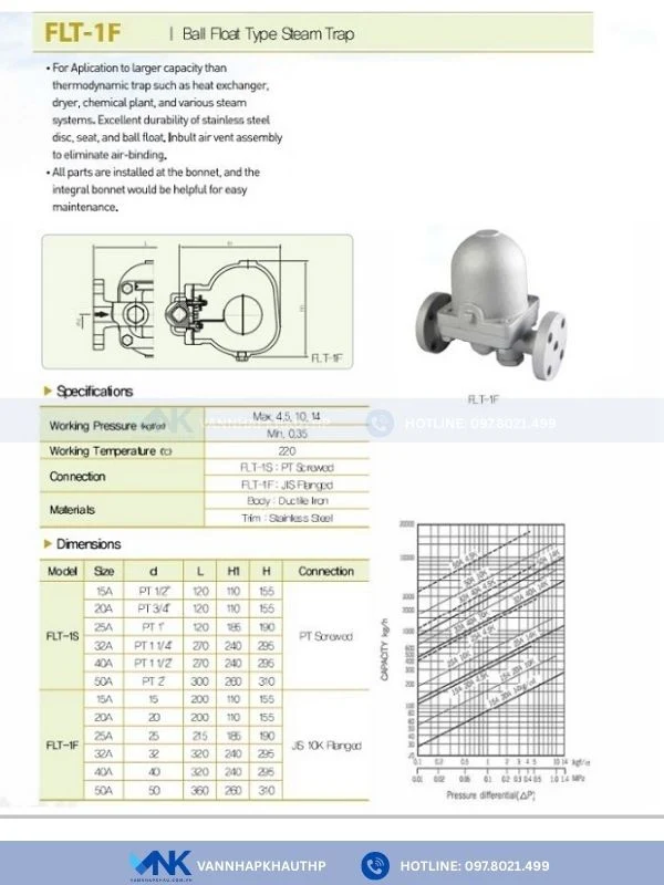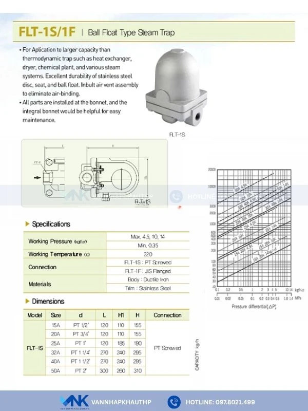Giống như các model khác của YNV, FLT-1S cũng sử dụng thân gang dẻo kết hợp phao inox cho độ bền cao, chịu nhiệt, chịu áp tốt, đảm bảo hiệu quả vận hành ổn định lâu dài. Tuy nhiên, khác với FLT-1F sản phẩm này sử dụng kết nối ren nhỏ gọn, giúp việc lắp đặt dễ dàng, nhanh chóng, phù hợp với các hệ thống hơi quy mô nhỏ, kích thước từ DN15-DN50