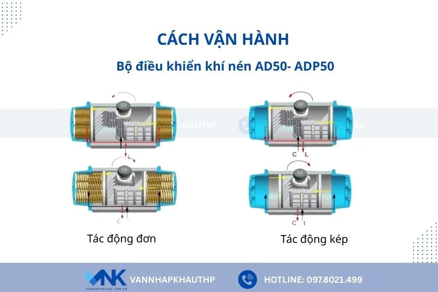 Về nguyên lý hoạt động, có bản bộ điều khiển khí nén AD50-ADP50 vận hành dựa trên nguồn áp lực khí nén được cấp vào để tạo ra momen xoắn và tác động lên van. Chi tiết về cách thức hoạt động sẽ tùy thuộc loại tác động đơn hay tác động kép, cụ thể như sau: