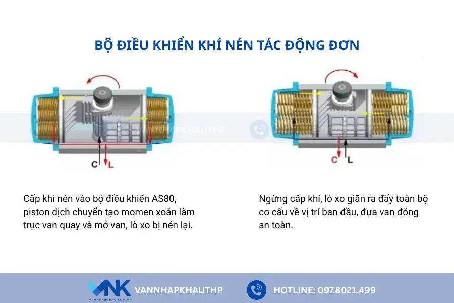 Bộ điều khiển khí nén AS80 là dạng tác động đơn có lò xo đàn hồi nên khi vận hành chỉ cần cấp khí nén ở 1 chu trình, lò xo sẽ đảm nhiệm chiều chuyển động ngược lại. Cụ thể như sau:
