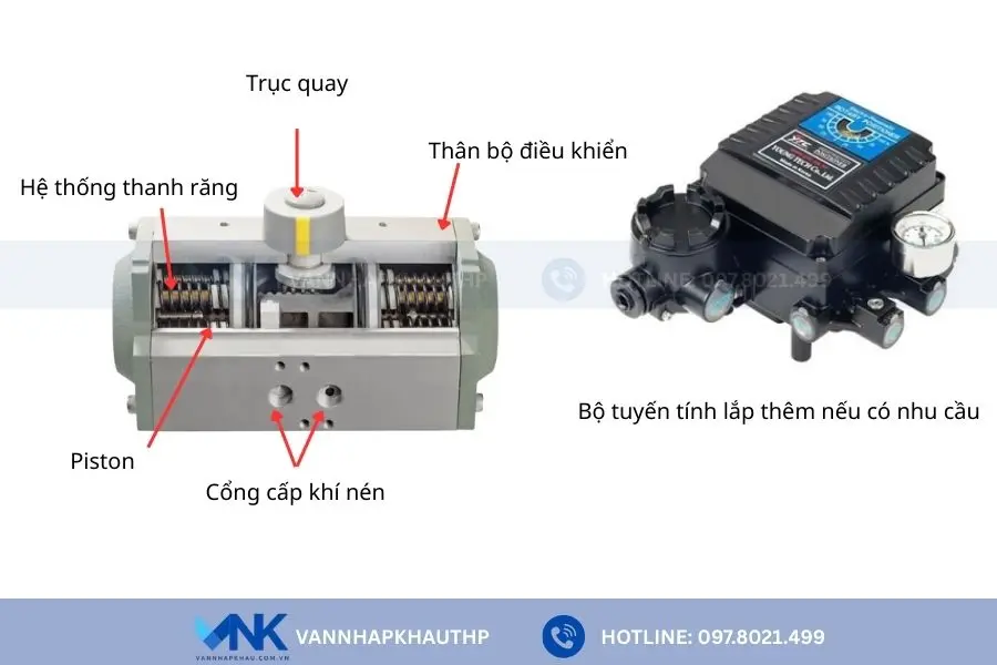 - Piston và thanh răng: Là bộ phận có nhiệm vụ chuyển đối năng lượng khí nén thành chuyển động cơ học, tạo momen xoắn. Cụ thể khi khi nén được cấp vào bộ điều khiển, áp lực khí nén sẽ đẩy piston di chuyển tịnh tiến, kéo theo thanh răng và tạo lực momen xoắn tác động lên hệ thống bánh răng.