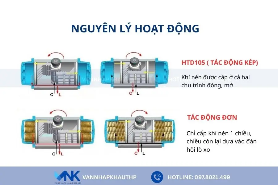 Khác với bộ truyền động tác động đơn chỉ dùng khí nén cho một chiều và lò xo đàn hồi cho chiều còn lại, HTD105 tác động kép sử dụng khí nén cho cả hai chiều, giúp lực ổn định hơn và điều khiển van chính xác trong các hệ thống tự động hóa.