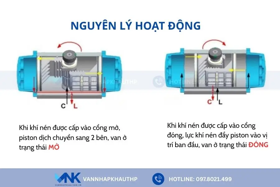 - Khi khí nén được cấp vào cổng mở, áp lực khí nén sẽ đi đến khoang giữa của xi lanh, đẩy piston dịch chuyển sang 2 bên. Lực tác động này sẽ khiến thanh răng – bánh răng quay, làm van chuyển sang trạng thái mở.