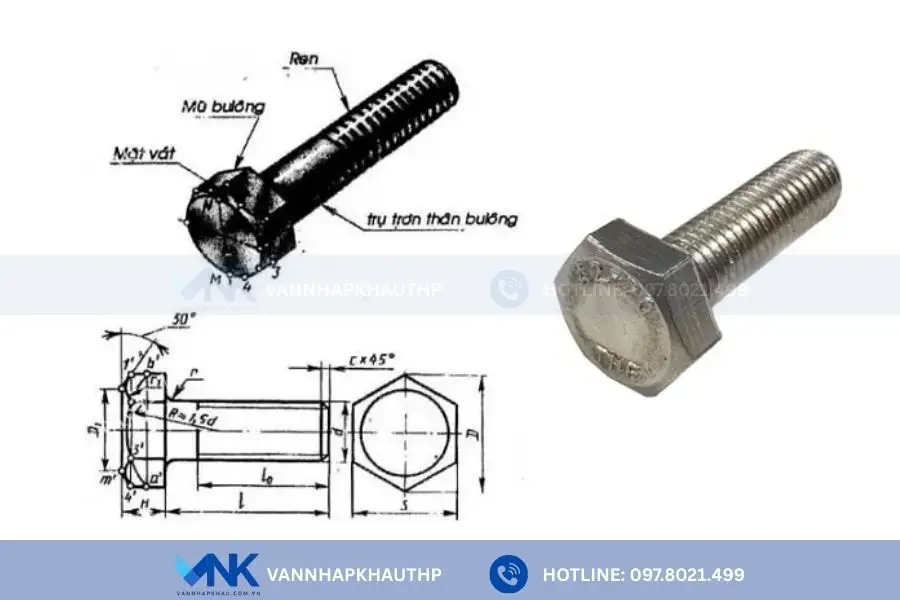 Về cơ bản, bulong inox được cấu tạo đơn giản gồm các bộ phận chính như sau: