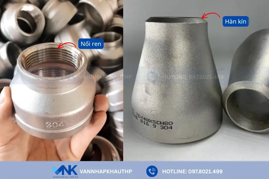- Đầu nhỏ: Là phần có đường kính nhỏ hơn được dùng để kết nối ống, thiết bị phía sau. Đầu nhỏ được sản xuất theo tiêu chuẩn SCH, DN… để tương thích với đường ống hiện có. Tuy theo chủng loại, đầu nhỏ có thể là nối ren, hàn hoặc gia công theo tiêu chuẩn vi sinh.