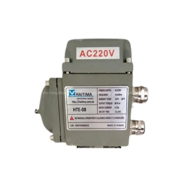 Động cơ điện HTE08 là loại động cơ điện thuộc series HTE của thương hiệu Haitima Đài Loan. Trên thân bộ điện có dán tem thể hiện đầy đủ các thông số kỹ thuật cơ bản để người dùng dễ nhận diện hành chính hãng như model, điện áp, nhiệt độ, thời gian đóng mở và logo, thương hiệu Haitima đi kèm xuất xứ Taiwan.
