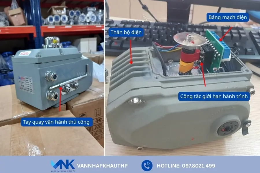 - Bên trong bộ điện có bảng mạch điện để đấu nối, motor điện tiếp nhận nguồn điện và tạo ra lực momen xoắn, hệ thống bánh răng, trục quay để nhận tác động, momen xoắn và truyền xuống van cần điều khiển.