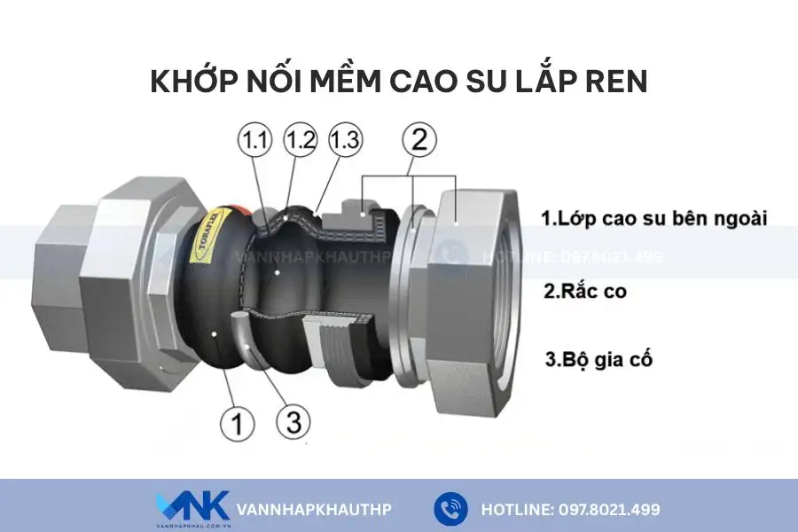 Khớp nối mềm cao su lắp ren được cấu tạo từ ba bộ phận chính, mỗi bộ phận đảm nhiệm một chức năng riêng. Cụ thể dưới đây: