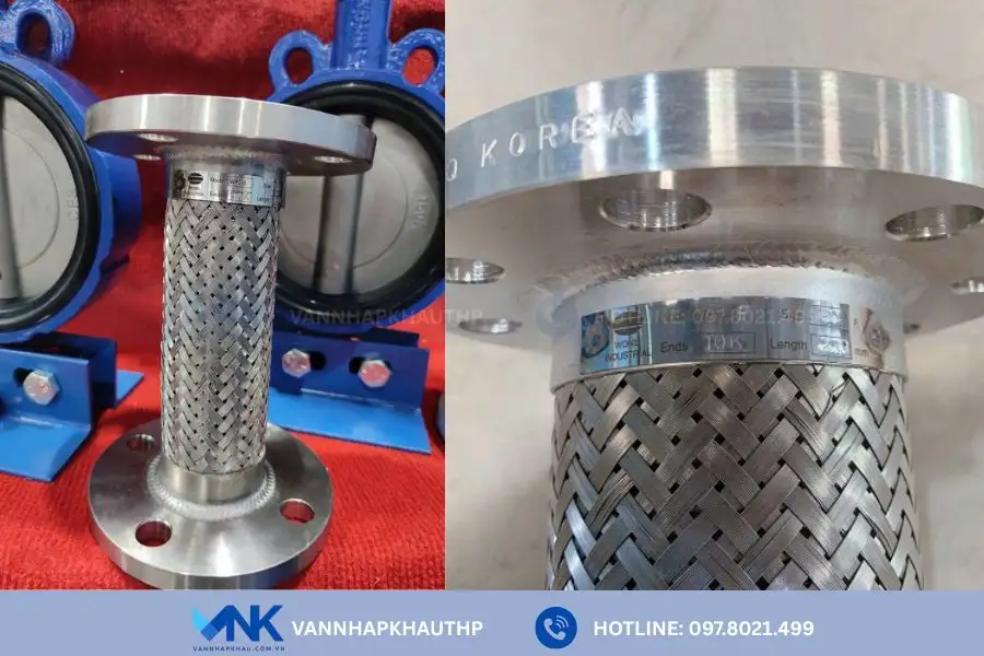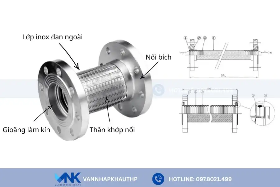 ✅ Kết cấu thân khớp nối bằng inox, bên ngoài có các lớp inox đa chéo giúp hấp thụ giãn nở nhiệt tốt, bù sai lệch trong quá trình hoạt động.