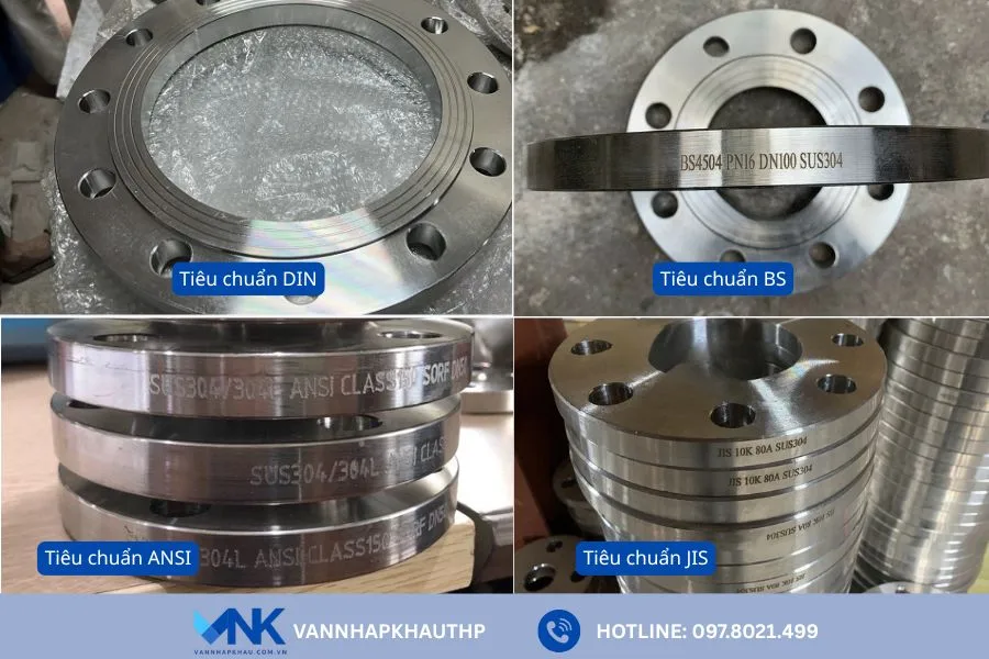 Ngoài thiết kế, mặt bích inox còn được phân loại theo các tiêu chuẩn sản xuất khác nhau để phù hợp với từng hệ thống đường ống. Một số tiêu chuẩn phổ biến gồm: