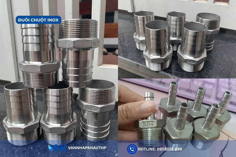 Đuôi chuột inox được sử dụng để nối đường ống lại thông qua đầu ren có kích thước tương đồng. Sản phẩm có đa dạng kích thước lớn hoặc nhỏ tùy theo nhu cầu sử dụng, phù hợp cho cả hệ thống dân dụng và công nghiệp.