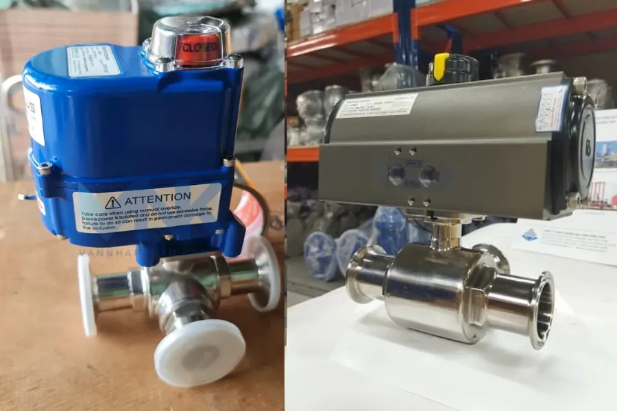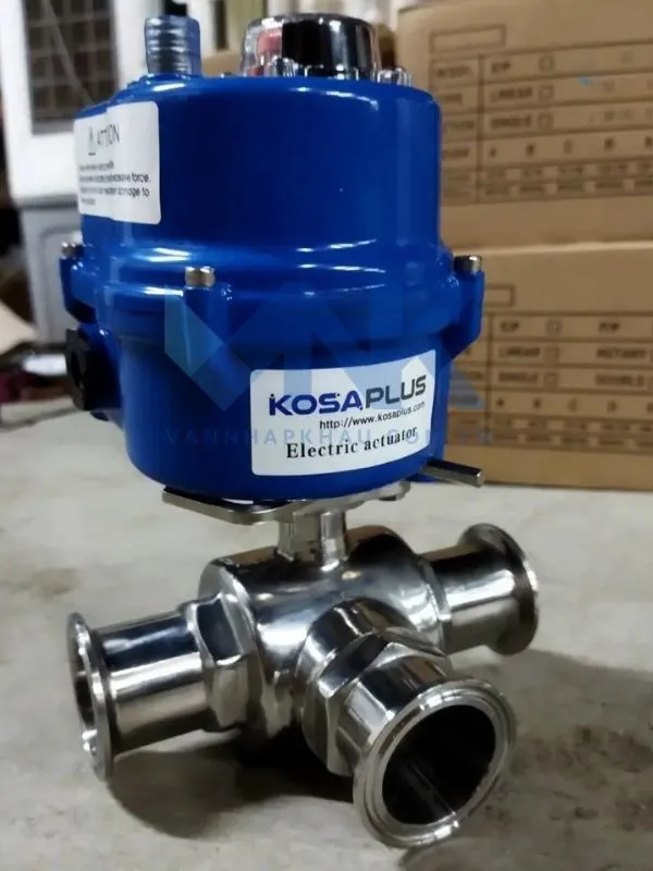 Mẫu sản phẩm này có thân van bằng inox vi sinh cao cấp, tích hợp bộ điều khiển là động cơ điện có khả năng điều khiển đóng/mở tự động theo tín hiệu điều khiển từ xa. Ưu điểm được sản xuất kích cỡ lớn, tự động hóa cao, vận hành chính xác. Quan trọng có thể kết nối với hệ thống trung tâm để điều khiển từ xa. Hệ thống ứng dụng điển hình các dây chuyền sản xuất tự động hóa, yêu cầu liên tục và cần vận hành nhiều van cùng một thời điểm. Nhược điểm, giá thành tương đối cao so với tay gạt.