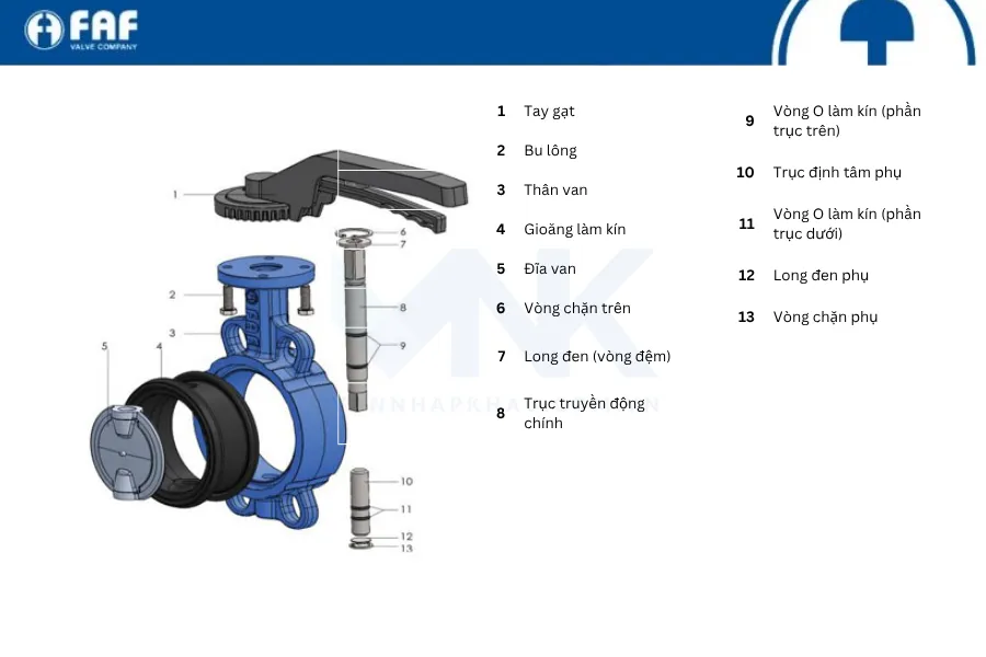 Về cấu tạo, van bướm tay gạt FAF 3500 được thiết kế cơ bản tương tự các dòng van bướm khác, cụ thể gồm các bộ phận chính như sau: