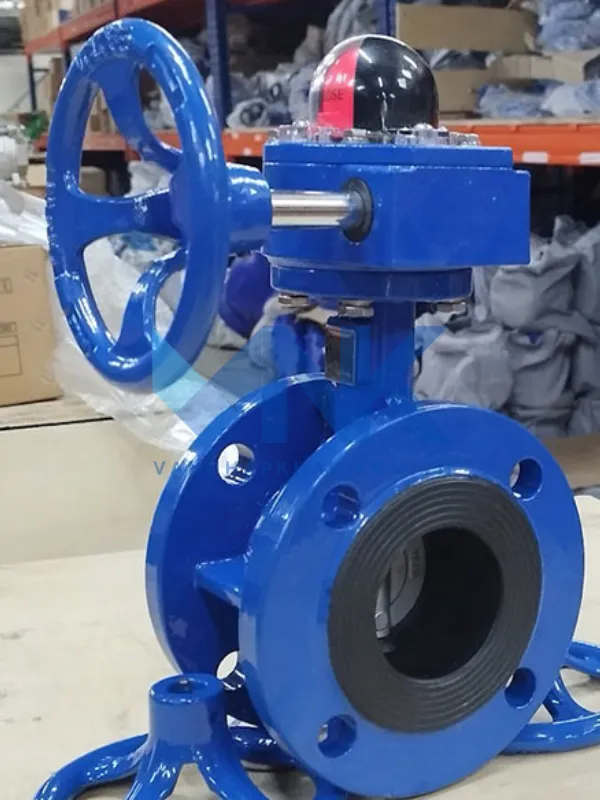 Van bướm tay quay 2 mặt bích được thiết kế 2 mặt bích đúc 2 bên thân van, khi kết nối cần dùng bulong, đai ốc để cố định. Van sử dụng mặt bích đa tiêu chuẩn JIS, BS, DIN, ANSI và phù hợp cho các đường ống lớn, áp suất cao và rung động mạnh. Về giá thành cao hơn dạng wafer nhưng độ bền bỉ, khả năng làm kín cao hơn.