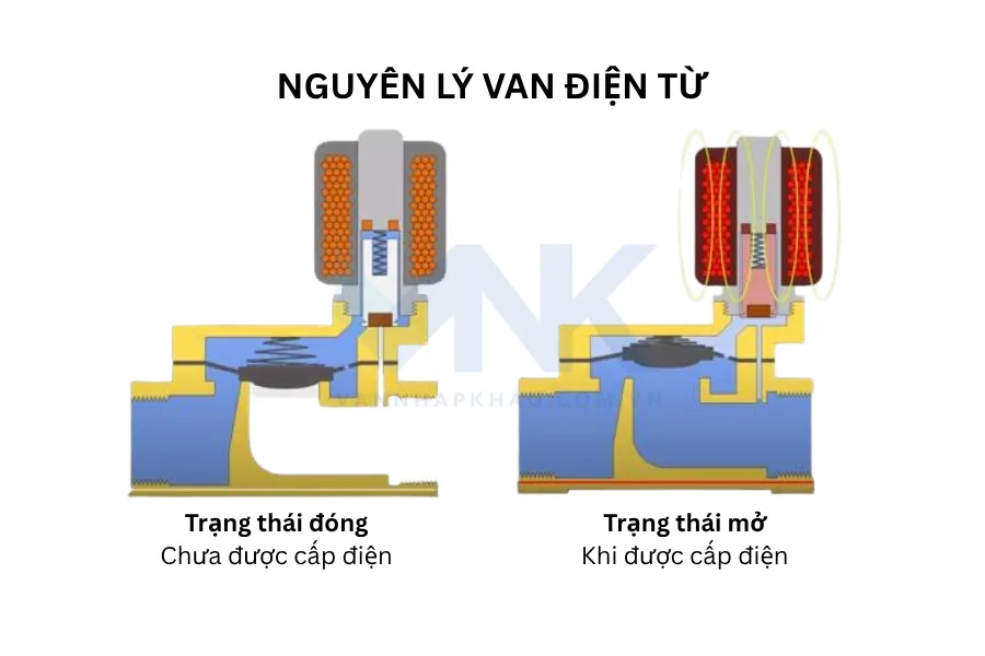 Khi ngừng cấp điện, lực hút từ trường mất đi, lò xo đàn hồi sẽ đẩy ty van, mang van lên trên, tạo khe hở trên thân van, cho phép lưu chất đi qua. Van ở trạng thái ban đầu, luôn mở.