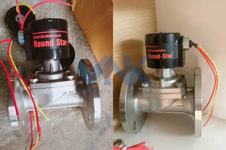 Van điện từ Round star xuất xứ từ thương hiệu Round star có nguồn gốc tại Đài Loan với kích cỡ lớn từ DN50 – DN150, chất liệu thân van gang dẻo bền bỉ, chịu áp lực cao, bên ngoài sơn Epoxy màu xanh. Kiểu kết nối với đường ống dạng lắp bích chắc chắn, áp lực làm việc max 10 bar, model DFD. Lưu chất sử dụng phổ biến nước sạch, nước thải.