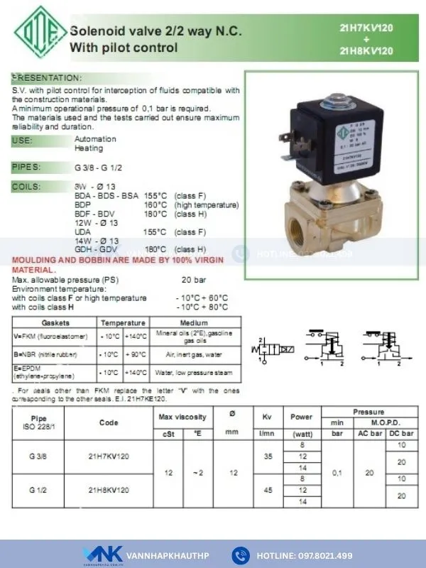 Catalogue van điện từ đồng nối ren ODE Model 21H8KV120