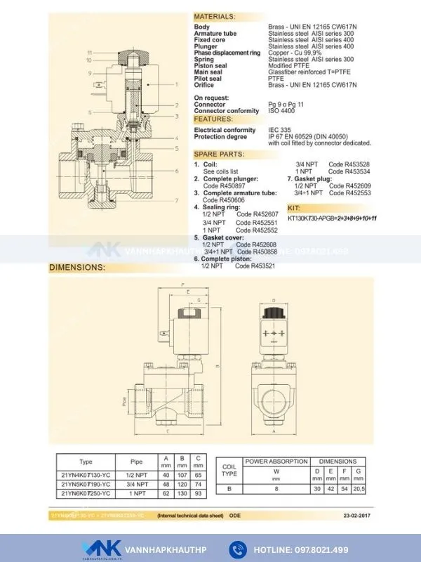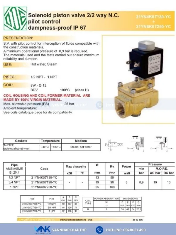 Catalog van điện từ đồng nối ren ODE 21YN4Z0T130-YC, 21YN6Z0T250-YC