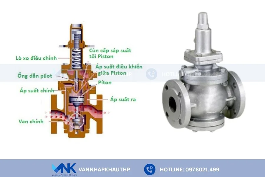Van giảm áp hơi nóng hoạt động dựa trên nguyên lý cân bằng giữa lực lò xo và áp suất của môi chất hơi nóng. Khi áp suất đầu ra vượt quá mức cài đặt, màng van sẽ đẩy đĩa van xuống để thu hẹp tiết diện dòng chảy, qua đó làm giảm áp suất một cách tự động.