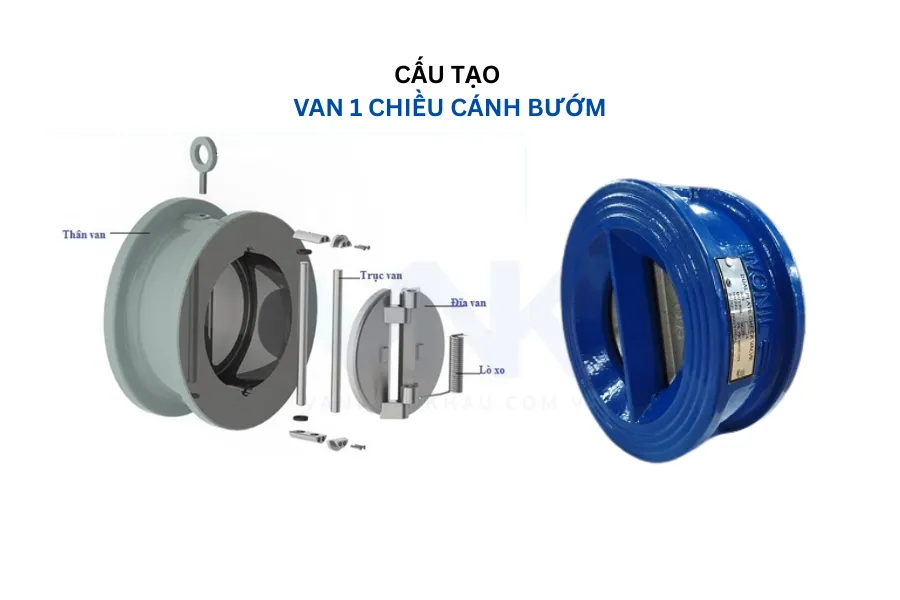 Van một chiều cánh bướm được cấu tạo bởi 04 thành phần chính là: thân van, trục van, đĩa van dạng cánh bướm và lò xo.