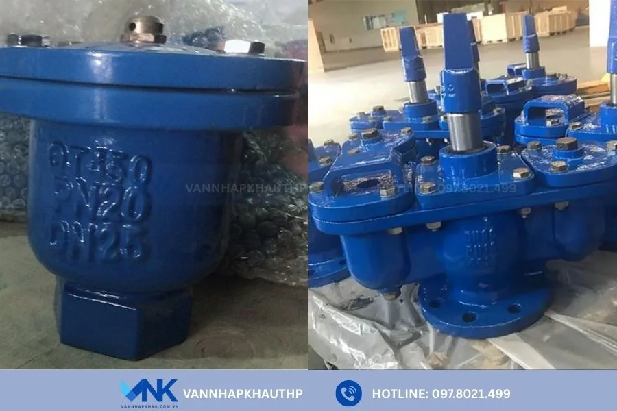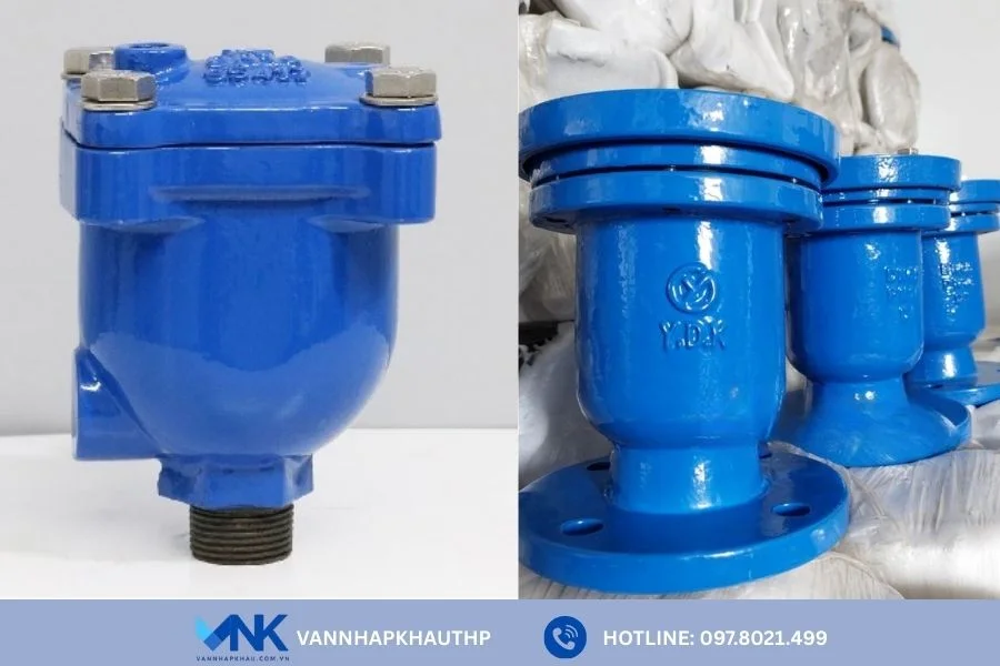 - Van xả khí gang đôi: Có hai buồng chứa khí cho phép xả khí nhanh và hiệu quả hơn so với loại đơn. Loại van này được sử dụng rộng rãi trong các hệ thống lớn, đường ống dài hoặc nơi áp suất cao, nhờ khả năng giảm rung lắc, bảo vệ thiết bị và duy trì dòng chảy ổn định.