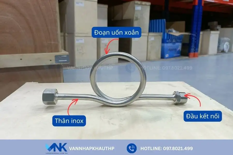 Là vòng xoắn cuộn tròn được uốn từ chính phần thân ống, đây cũng là điểm đặc trưng dễ nhận biết của xi phông inox. Chức năng tăng chiều dài đường dẫn để làm giảm nhiệt độ lưu chất đồng thời còn giúp cách nhiệt, hấp thụ rung động, giảm sốc áp cho lưu chất trước khi đi vào đồng hồ đo áp.